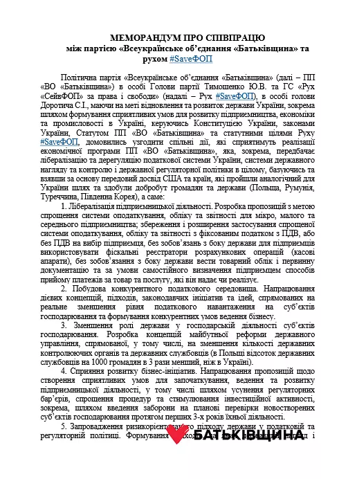 «Запровадження ПДВ для ФОПів – це вбивство середнього класу та загроза економічній стабільності в Україні. Нам треба об’єднатися, щоб дотиснути владу й зупинити це безглузде і небезпечне рішення», – заявила Юлія Тимошенко після підписання меморандуму.