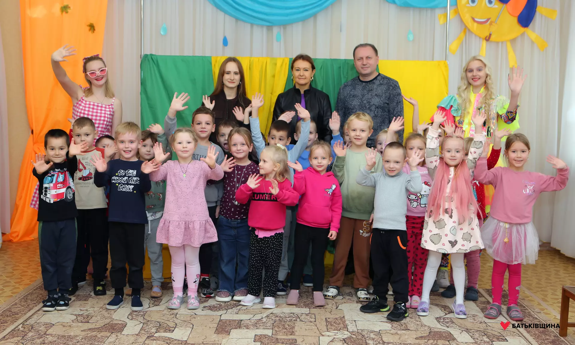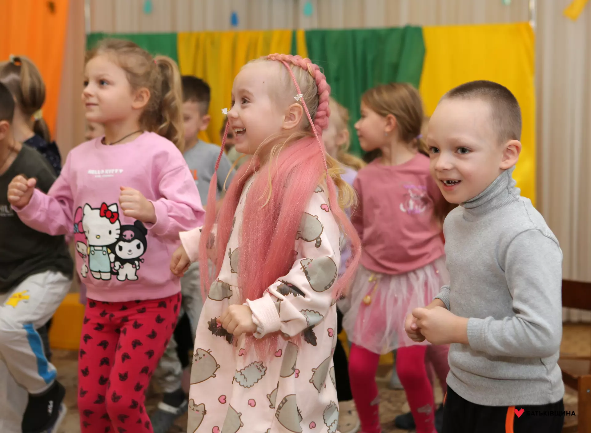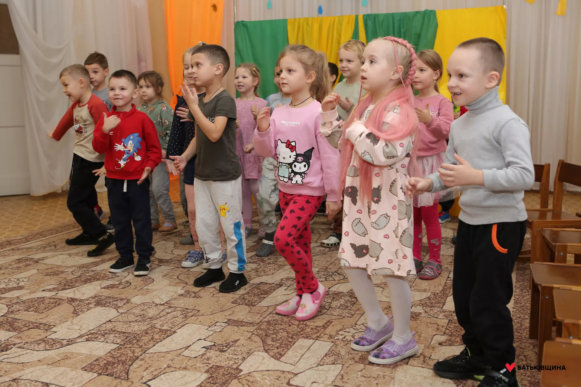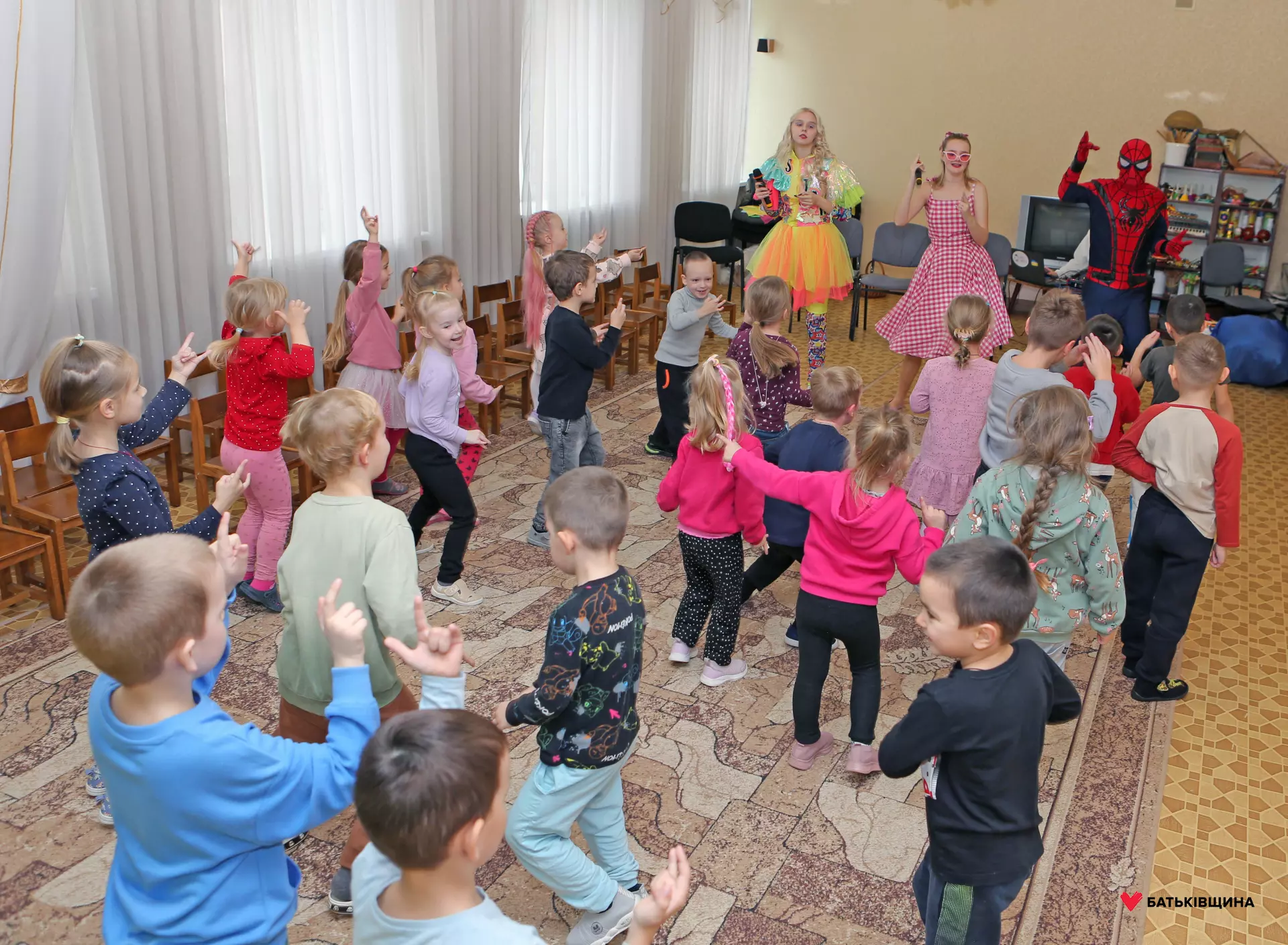 Аніматори у яскравих костюмах одразу заволоділи увагою дітей — малюки із захопленням повторювали рухи, брали участь у змаганнях, танцювали та раділи кожному моменту взаємодії