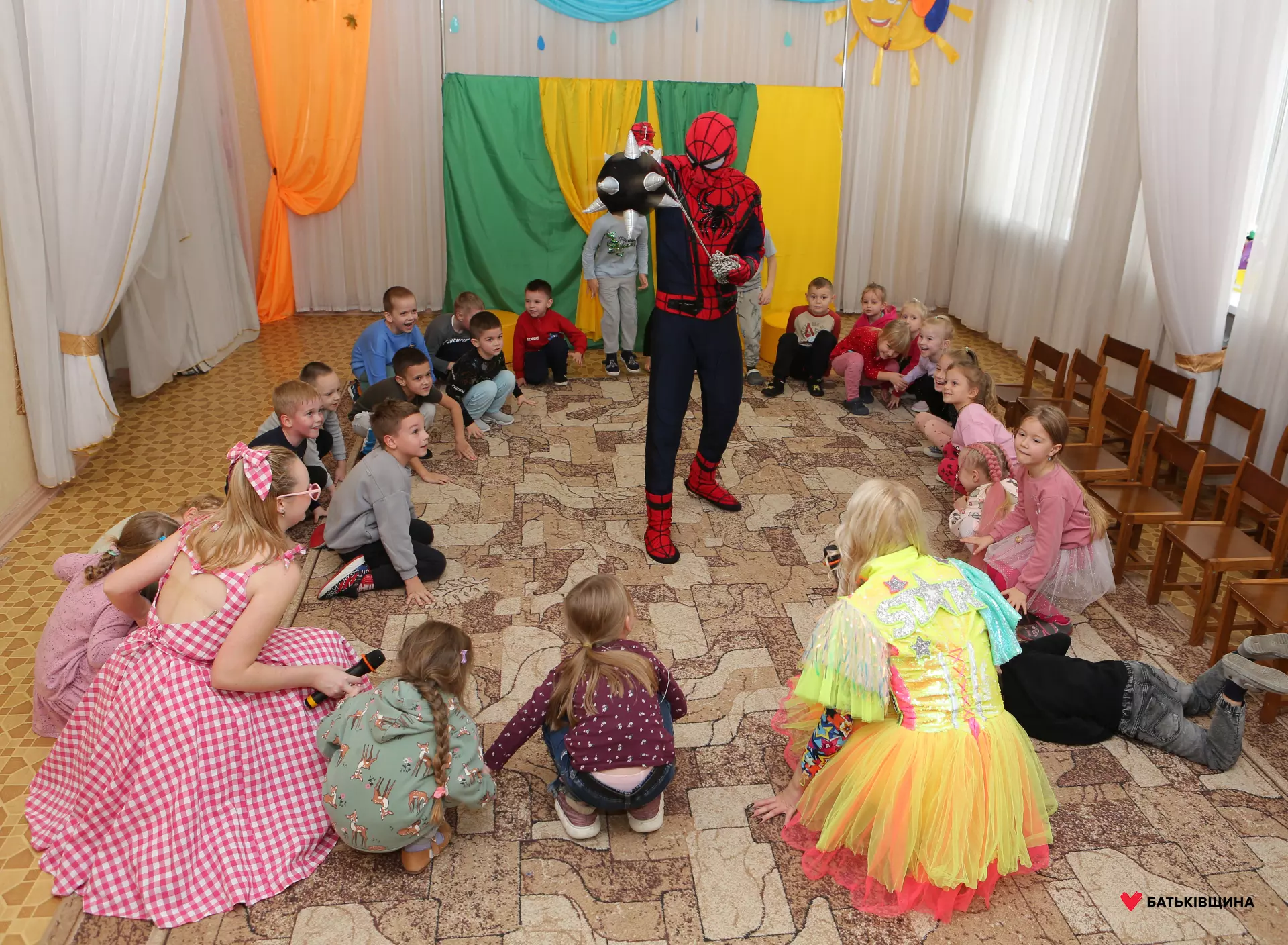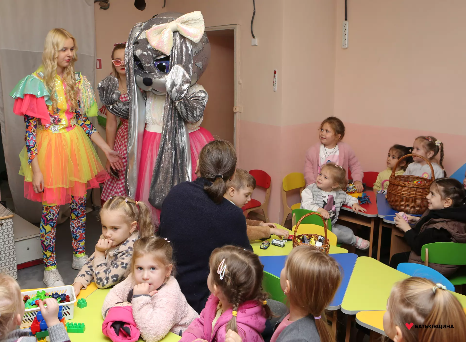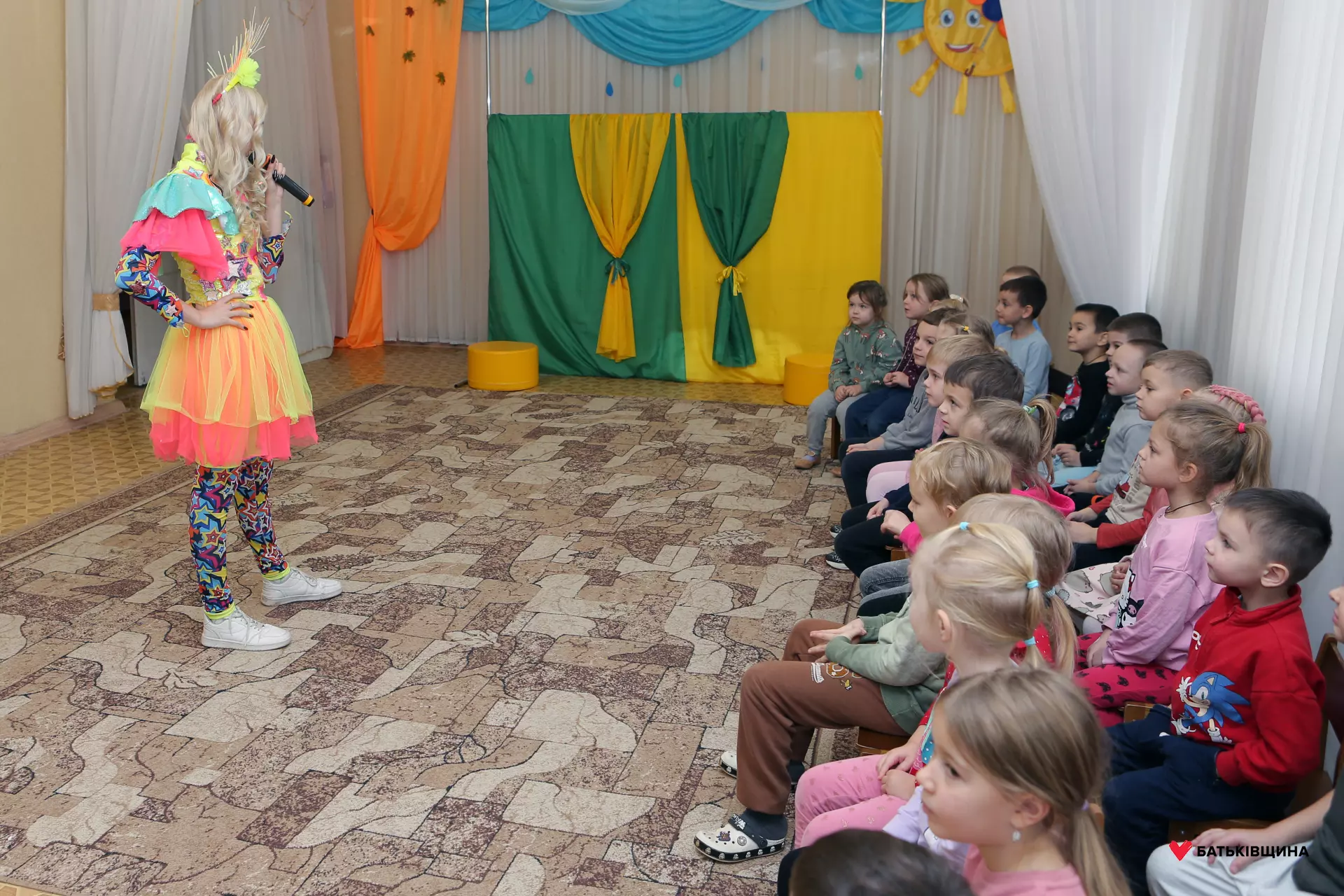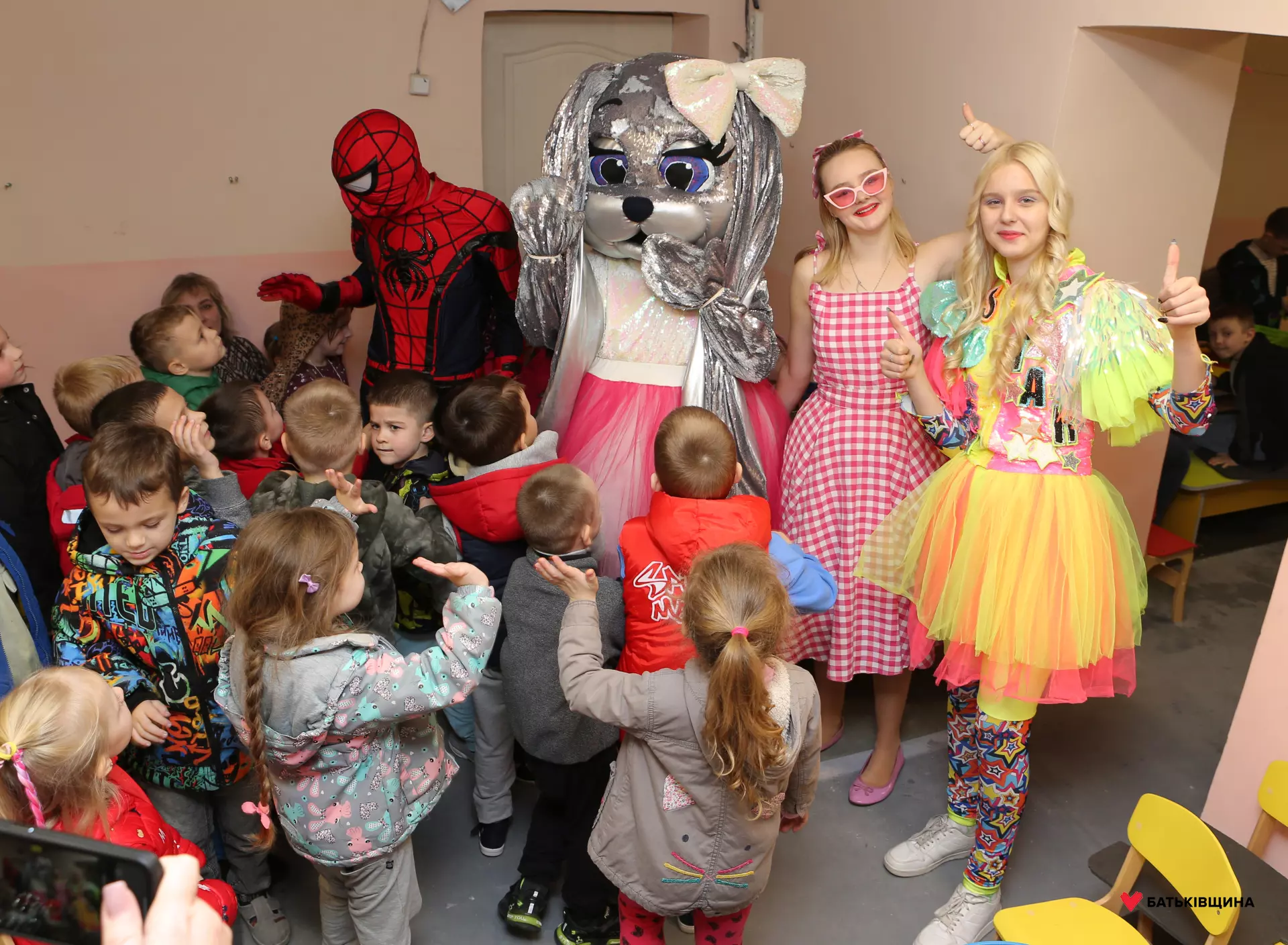 Аніматори у яскравих костюмах одразу заволоділи увагою дітей — малюки із захопленням повторювали рухи, брали участь у змаганнях, танцювали та раділи кожному моменту взаємодії