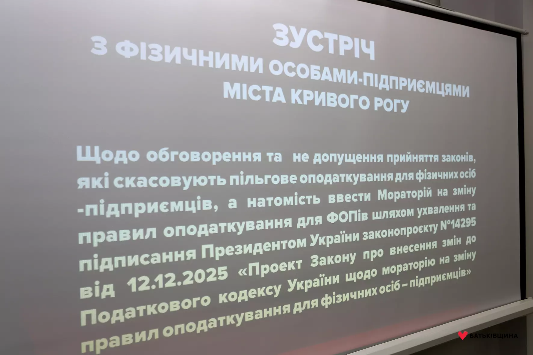 Під час зустрічі обговорювалося питання недопущення ухвалення законів, які скасовують пільгове оподаткування для ФОПів, а також ініціатива щодо впровадження мораторію на зміну правил оподаткування для фізичних осіб-підприємців шляхом ухвалення та підписання Президентом України законопроєкту №14295 від 12.12.2025 «Про внесення змін до Податкового кодексу України щодо мораторію на зміну правил оподаткування для фізичних осіб-підприємців». І як наслідок зустрічі - підписання звернення до Президента України та Голови Верховної Ради України щодо підтримки ініціативи.