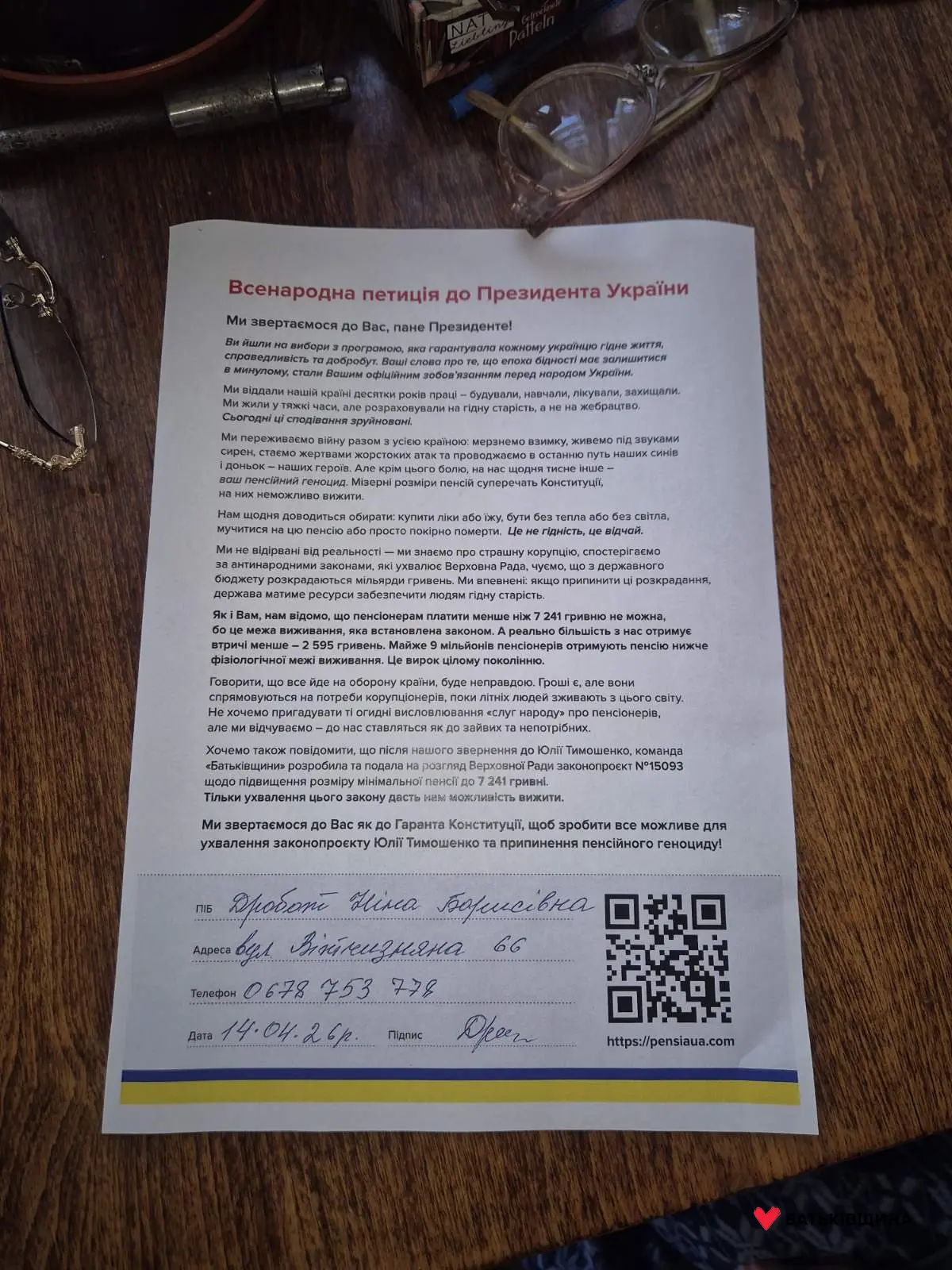 Мета ініціативи — підтримка законопроєкту №15093, що передбачає встановлення мінімальної пенсії на рівні 7 241 грн, як необхідного кроку до забезпечення гідного рівня життя громадян.
